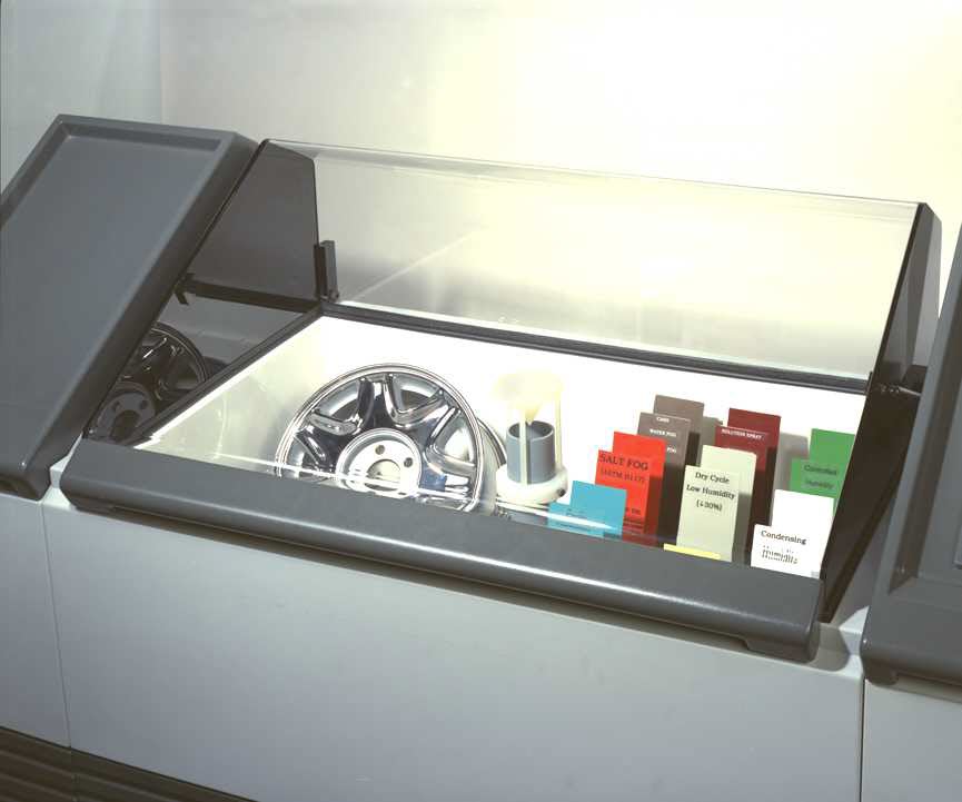 - Die beschleunigte Bewitterung von Materialien für Außenverkleidungskomponenten, Markenlogos, Spiegelgehäusen, Dachgepäckträgern und Dichtungen wird hauptsächlich nach OEM-Standards oder nationalen Normen (z.B. SAE, VDA, JASO) in Xenoninstrumenten wie den Atlas Ci Weather-Ometern, den Xenotest-Modellen oder SUNTEST XXL+ ST durchgeführt. Sehr oft sind vom OEM nur bestimmte Modelle mit definierter Konfiguration zugelassen. Einige veraltete japanische OEM-Prüfungen werden immer noch mit Sunshine Carbon Arc-Instrumenten durchgeführt (entwickelt in den 1930ern und in den 1990ern von Atlas ersetzt). Diese Prüfungen bieten die Atlas Dienstleistungslabore immer noch an.